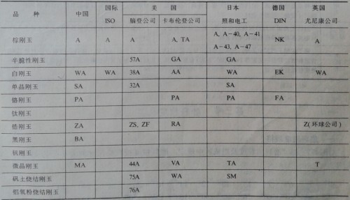 表1-1-2 國內(nèi)外剛玉磨料品種代號對照表